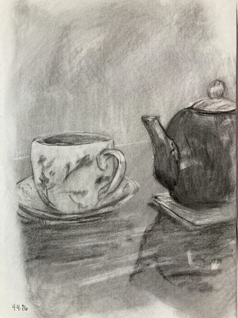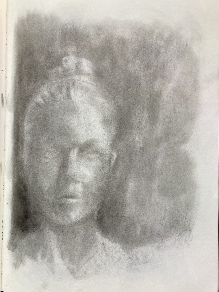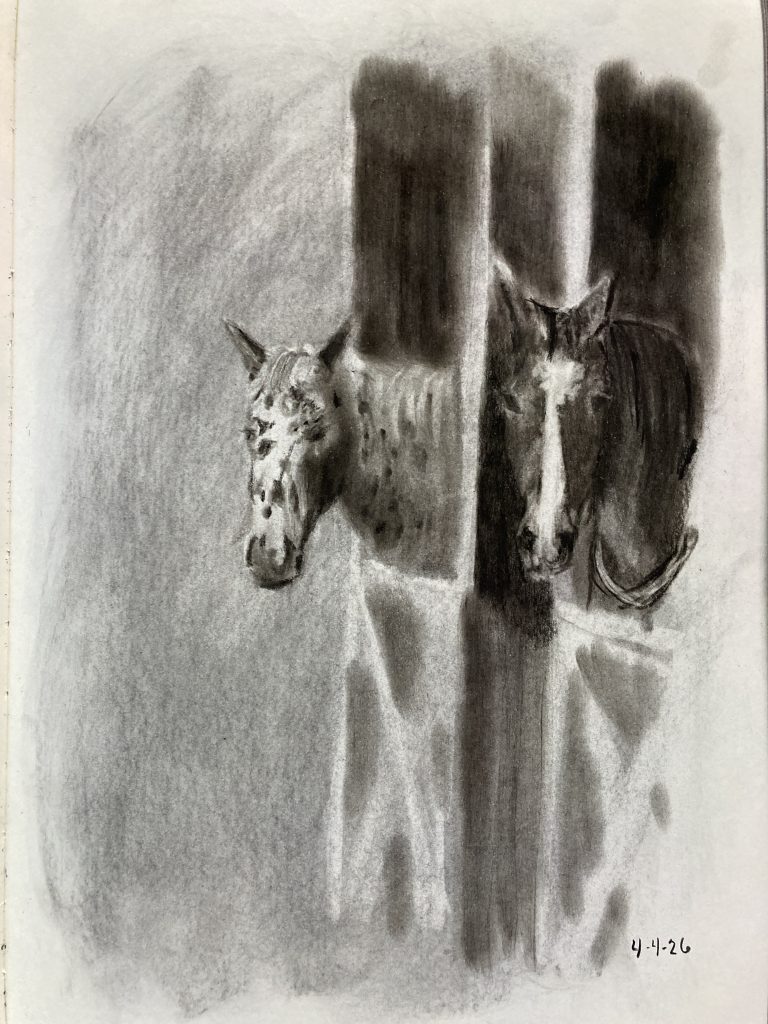 I had some fun using charcoal on a wood panel. I primed it first and then sprayed Spectrafix Final Fixative on it at the end. The reference photo is one I used before for my first (and so far only) oil painting. The wood grain really plays a role in the charcoal version, and with my next one, I’ll take it into account when planning.