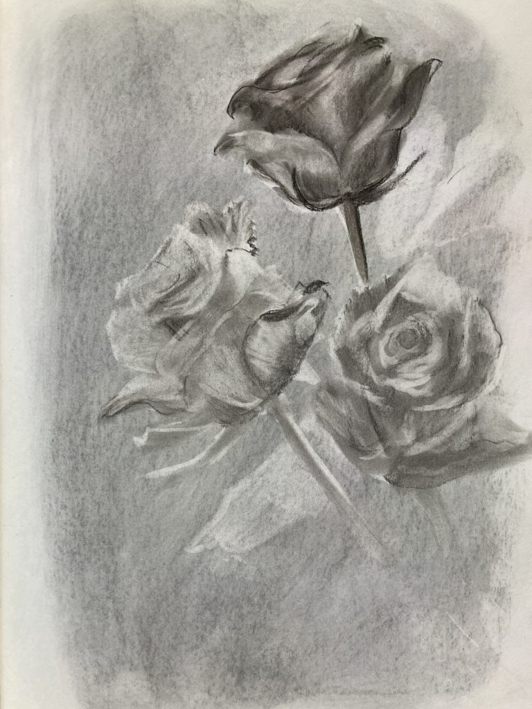 I also completed a Khadi sketchbook with these three charcoal flower sketches. I started thinking about charcoal and the wonderful moodiness of it after I re-watched an inspiring interview/demo with artist Kathleen Speranza. She paints a lot of roses, using graphite sketches for structure and charcoal for more of the feeling. Both are in preparation for the painting, so her sketches aren’t complete and yet they’re stunning. My attempts are a bit clunky, but I think I”m settling into a new way of using charcoal where I don’t ask it to be a sharp, graphite pencil and I’m happy that it isn’t paint. I’ve been spraying all of these with Spectrafix to keep smudging at bay.