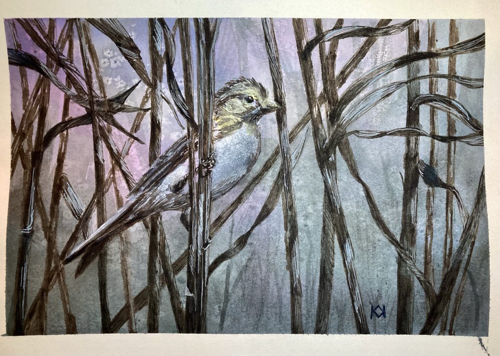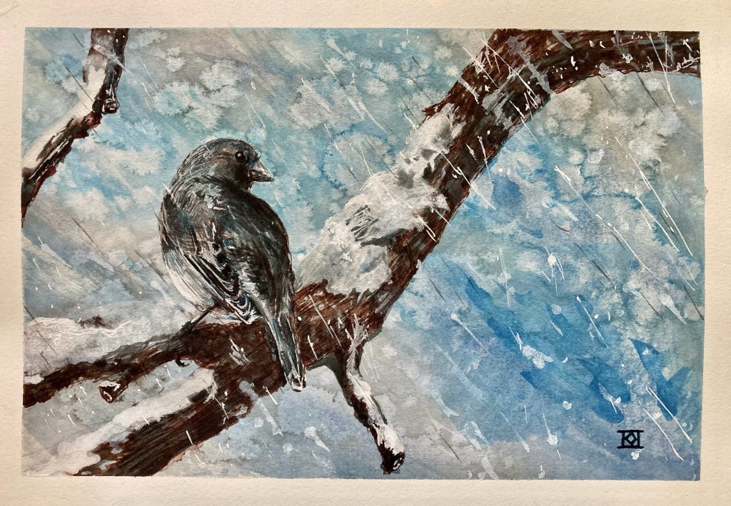 This is my fifth and final sparrow pen and ink drawing in this series. Why is it the last? I’ve run out of Arches hot press watercolor paper. These guys were taking vigorous baths in a very small, decorative pond in a park.
