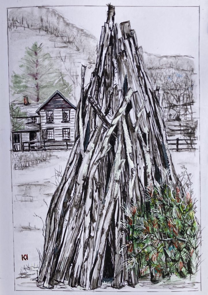This sketch covers two pages in my Stillman and Birn Zeta sketchbook, about 16”x10”. Ink is De Atramentis document ink in black.