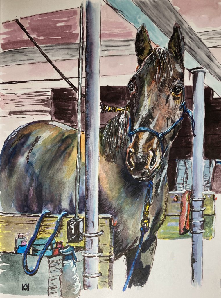 Instead of using a grid, I started with a detailed sketch and then transferred it with carbon paper. I used masking fluid to preserve some whites on this one.