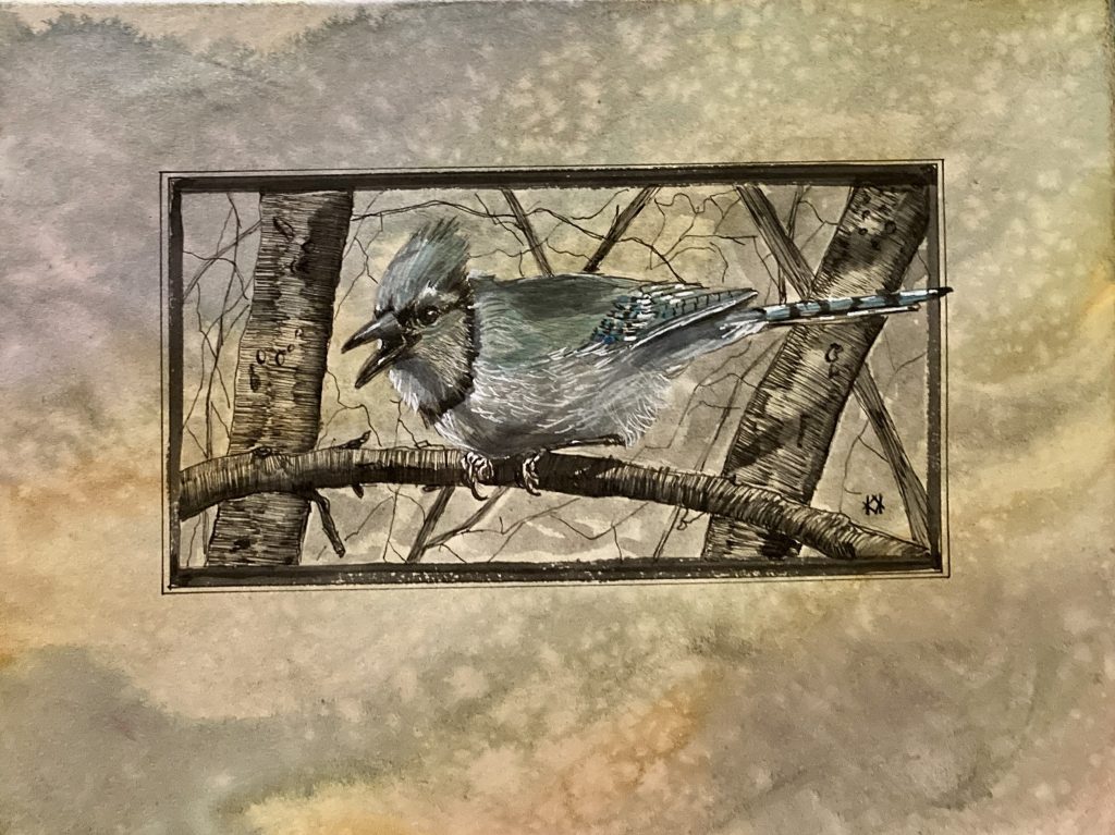I nearly gave up on this drawing after realizing I had made the bird too big for the frame, which I had already drawn in pencil and it wouldn’t erase. After considering it for a day, I simply let the tail push past the lines. I also went a little bit overboard on the white gel pen, which I can’t seem to give up with ink drawings.