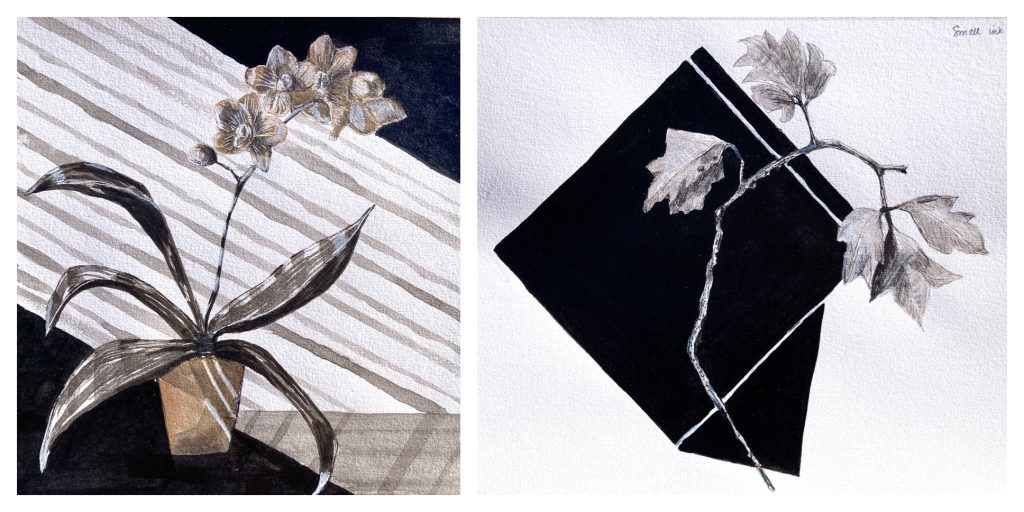 I took a class on Domestika to explore a little different style. These two pieces resulted from following Fujiko Rose’s modern botanical course. There are about four hours of instruction that covered some sketching, abstraction, planning, and creating a few works. Her style combines botanicals that lean toward realistic with abstracted elements. I really enjoyed it and got to spend some time using Indian ink with brushes and dip pens.