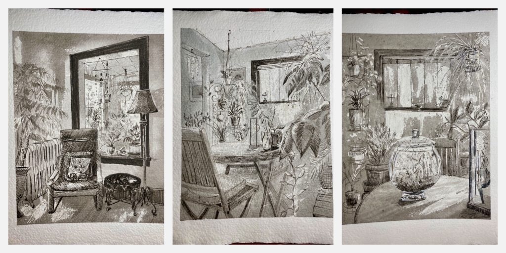 I decided to do some studies of our porch, and I truly enjoyed creating these. Our porch is a happy, warm place filled with plants and light, and I loved how they turned out. I used ink pens, washes, masking fluid, tape, etc., to see how the papers preformed. They were amazing! I love all three and can’t find anything negative to comment on.
