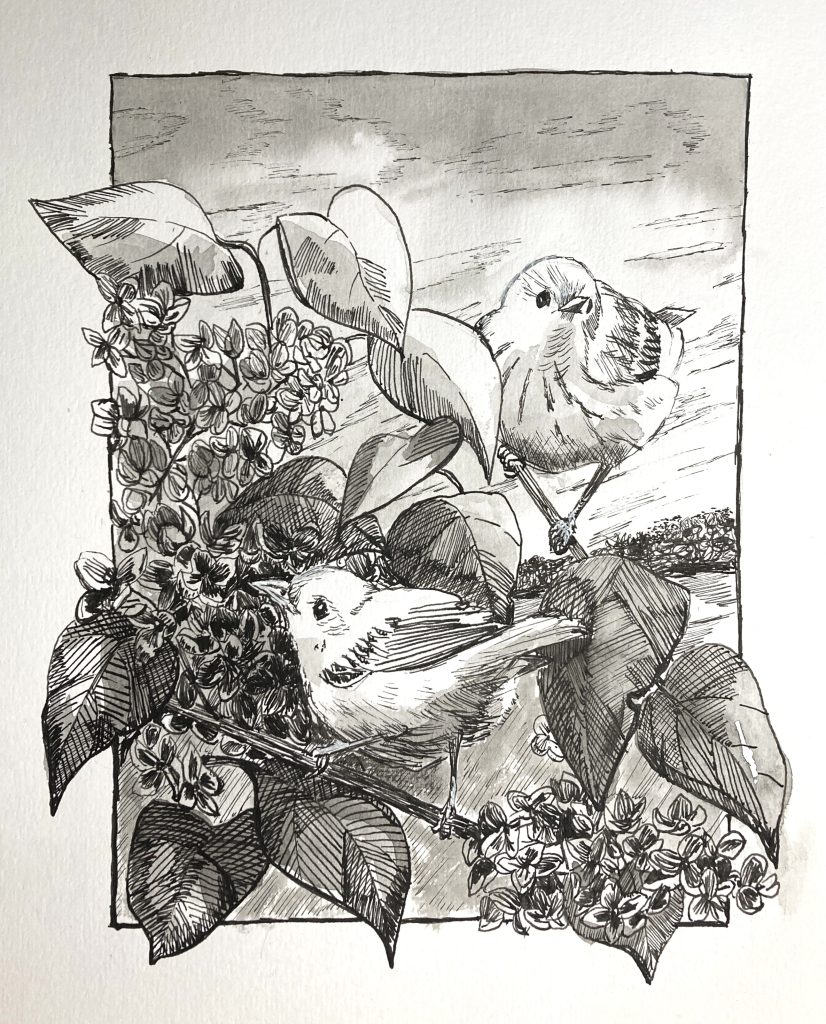 I actually completed an entire drawing without resorting to using an ink wash to soften my scribbly linework. If I could do this one over, I’d probably keep the treeline lighter and make the sunflower less “solid” looking. My goal was to create lights, darks, and grays with hatching and cross hatching. I created this drawing following a course by artist Philip Harris on the Domestika website.