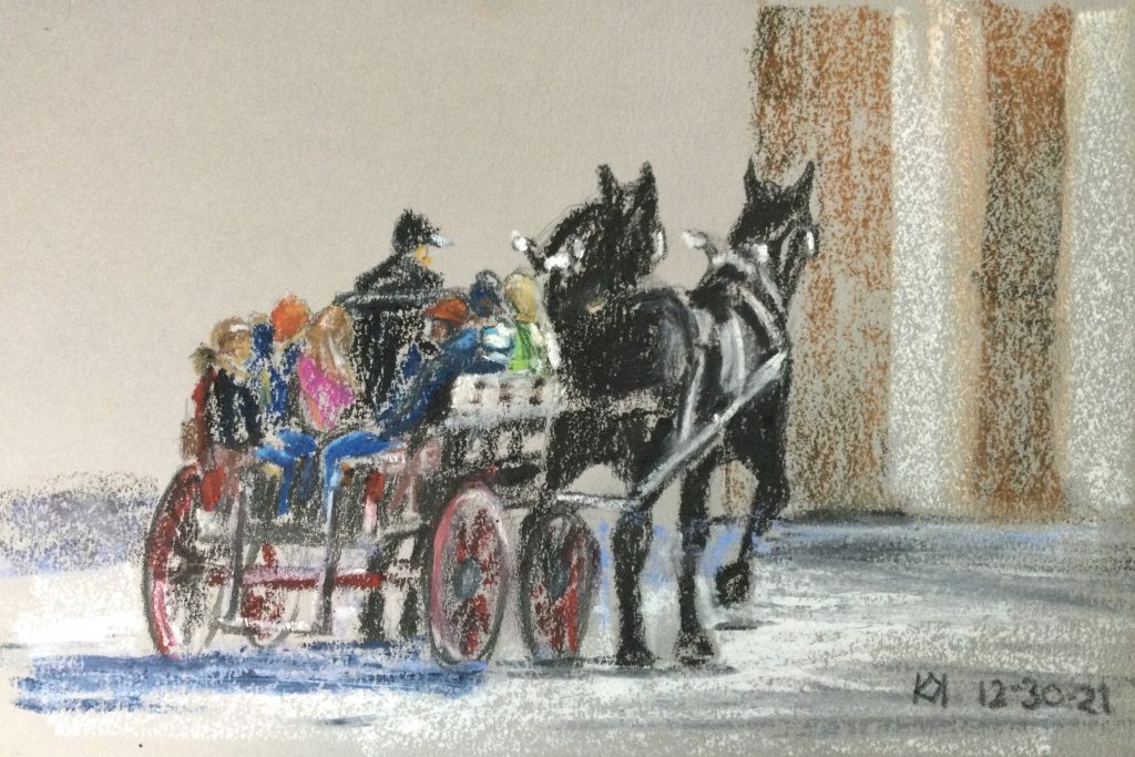 It was a surprise to walk around the corner and see these two horses pulling a festive group of people. Once, I drove a team of horses, and it was one of those thrilling experiences I’ll never forget.