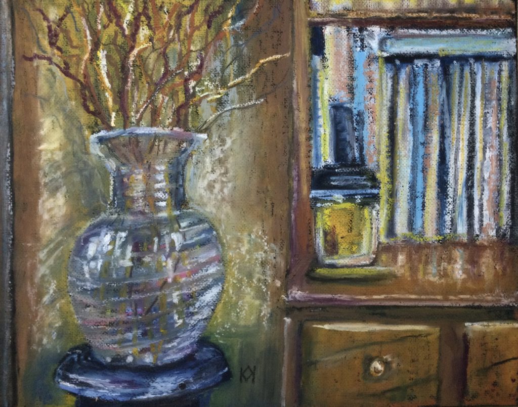 A corner of our living room today. In the winter, we get bright light from the low sun even when it’s overcast like it is today. The vase is from our wedding—30 years old!