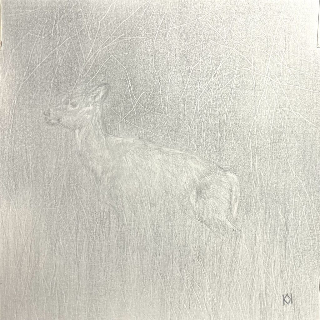Until tilted to the light, this looks like a hazy, gray smudge with no definition. The process was fast and fun. I used my aluminum “Brillo pad” for the background after I scored numerous, thin branches and grasses into the surface with the end of a paintbrush. The deer was sketched in gold.