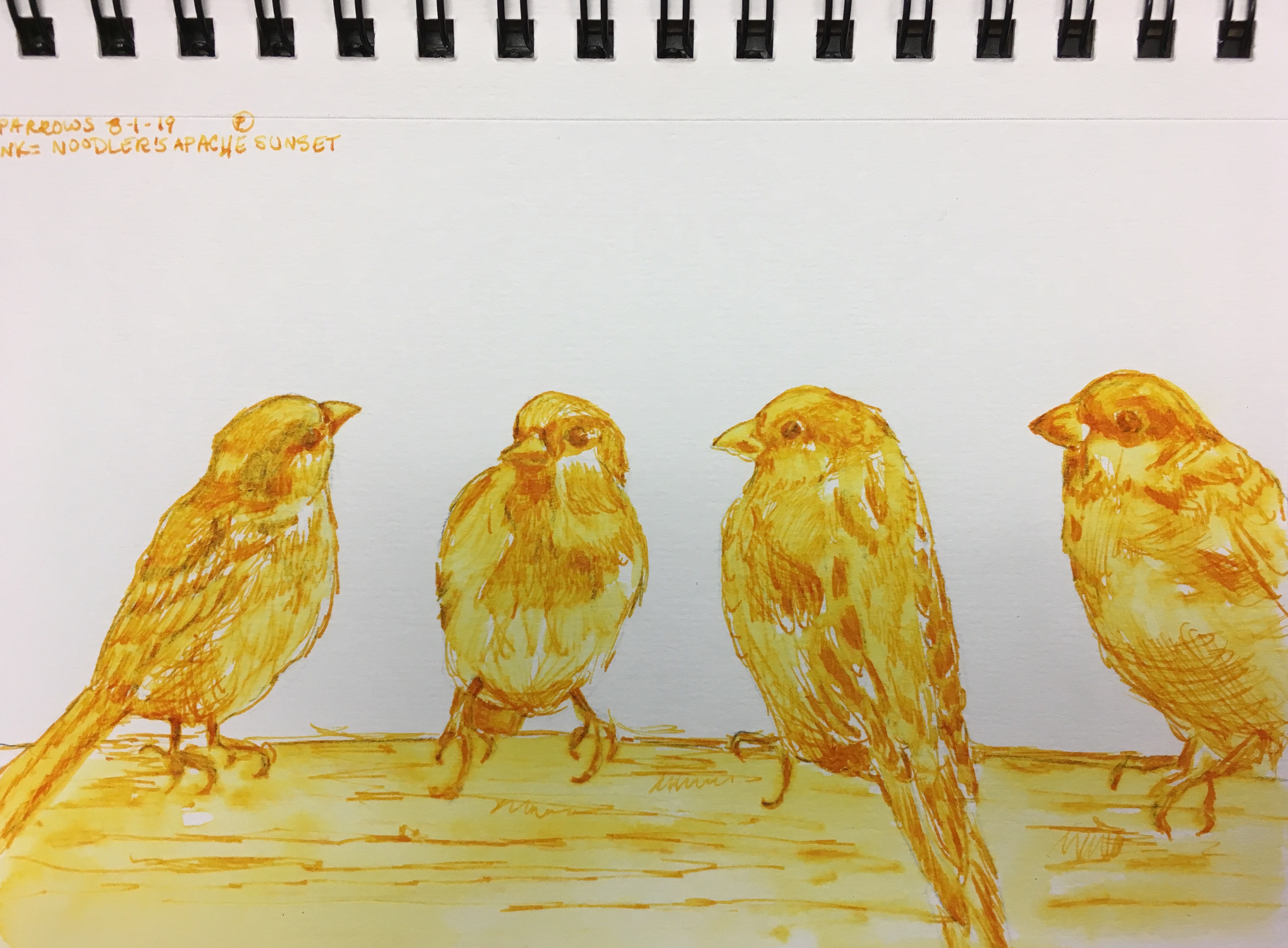 I’m still on that drawing-birds-with-ink-and-using-a-wash kick. I bought a second Wancai Moonman Mini fountain pen, this time filling it with Noodler’s Apache Sunset ink, also water soluble.