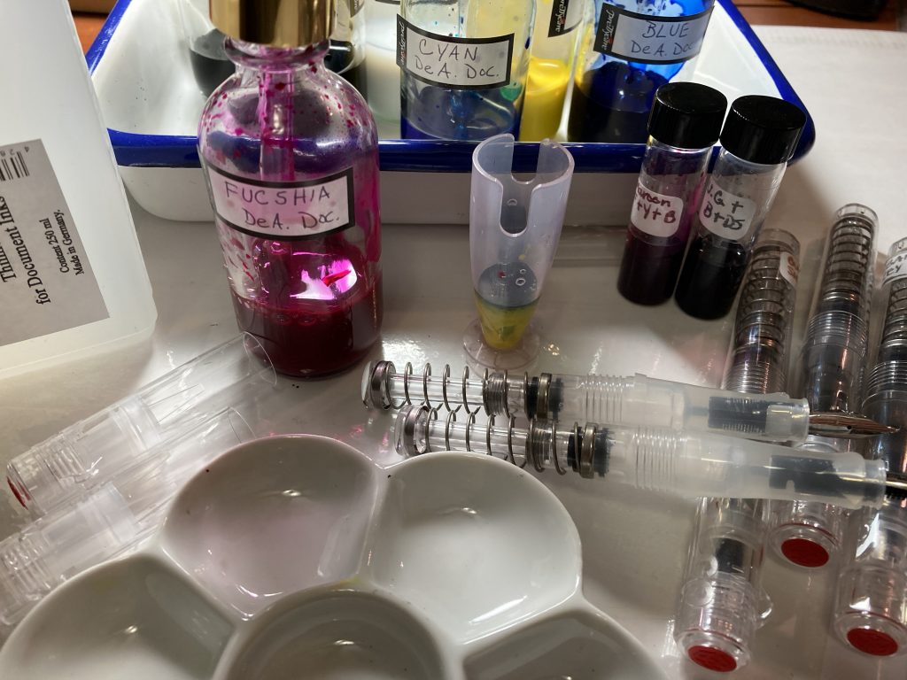 Document inks are pigmented, lightfast, archival, and mixable. I have fuchsia, blue, yellow, cyan, black, white, and urban grey. I decided on getting the blue as well as cyan because I love blues and cyan is cool, like a phthalo blue, while the one simply called blue is warm, like ultramarine. The mix together beautifully and also make different greens and purples. I love the de Atramentis dilution solution, too.