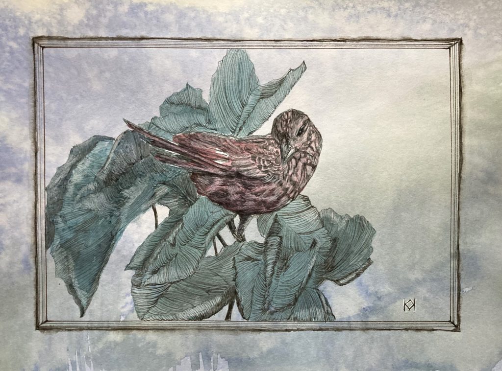 Ink is proving to be a truly fascinating medium. I’m continuing my moody backgrounds, drawing in my basic design with pencil, and then using a fountain pen for hatching and details. With this one, I felt like it was too gray, and I decided to add color. I’m really glad I did, sticking with greens and reds and a little bit of a white Inktense pencil for highlights (so much better than a gel pen). I’m really liking this combination, and if it wasn’t for the dreaded paper warping, I’d continue to use it for pretty much everything.