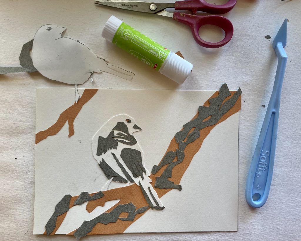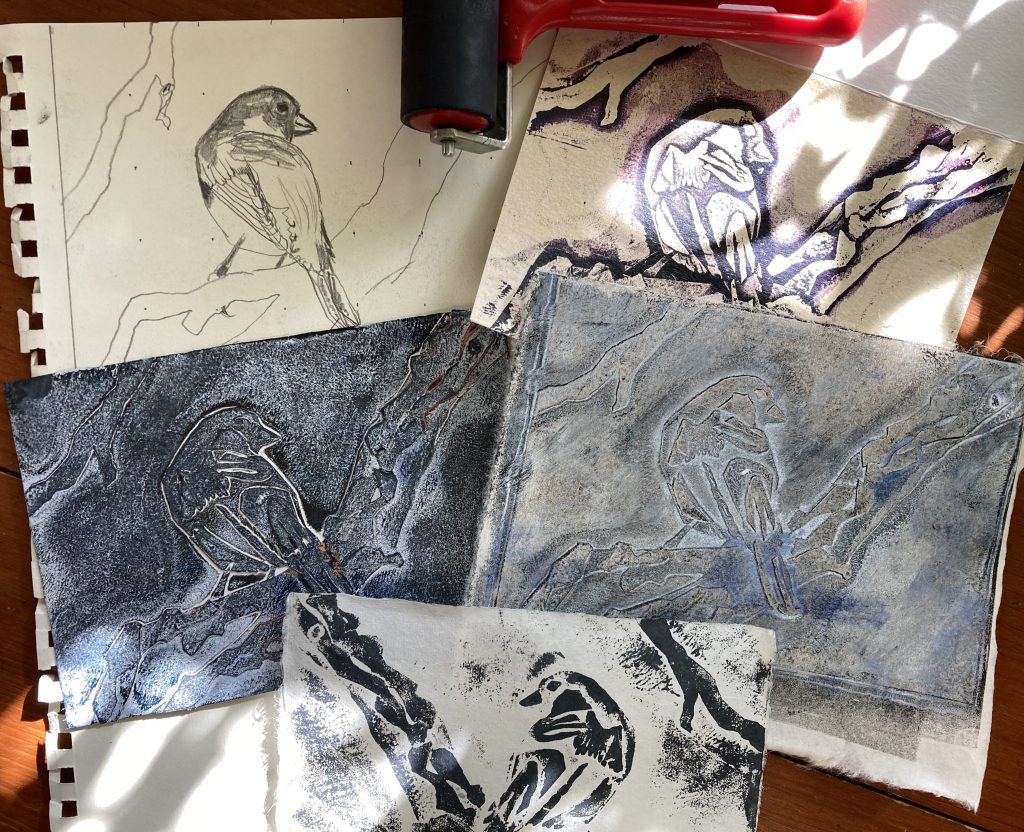 I started with a photo I took a few weeks ago of a Junco. From there, I created a simplified sketch, then I created a collagraph where I cut out my images and layered different areas with more cutouts. Up until this point, I had a great time.