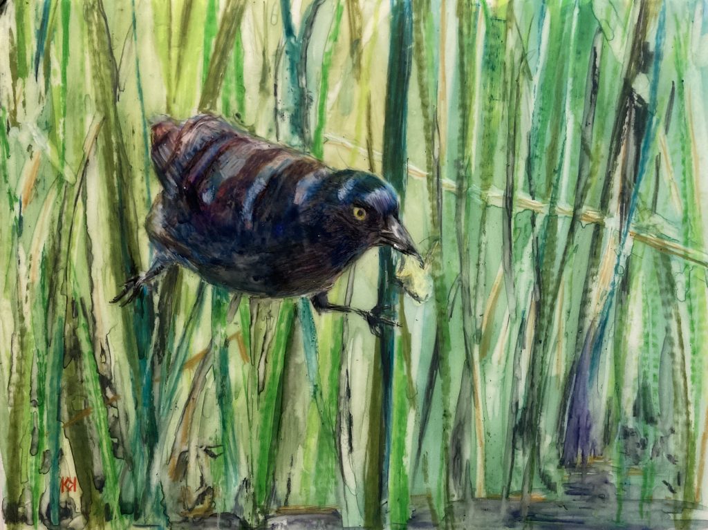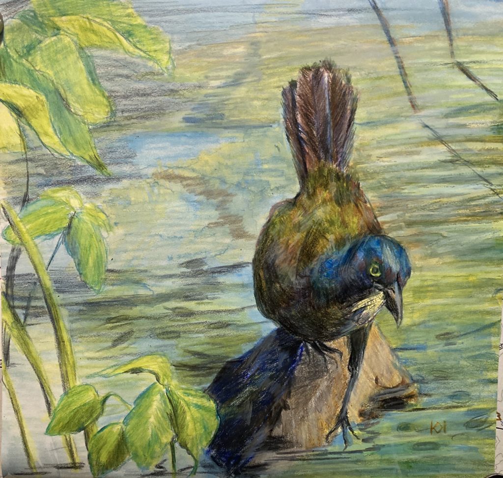 I’ve lost track of the number of grackles I’ve drawn recently. Six, maybe seven. I don’t think I’ve posted them all. I’m drawn to that iridescence, the yellow eye, and the way they move with such confidence.