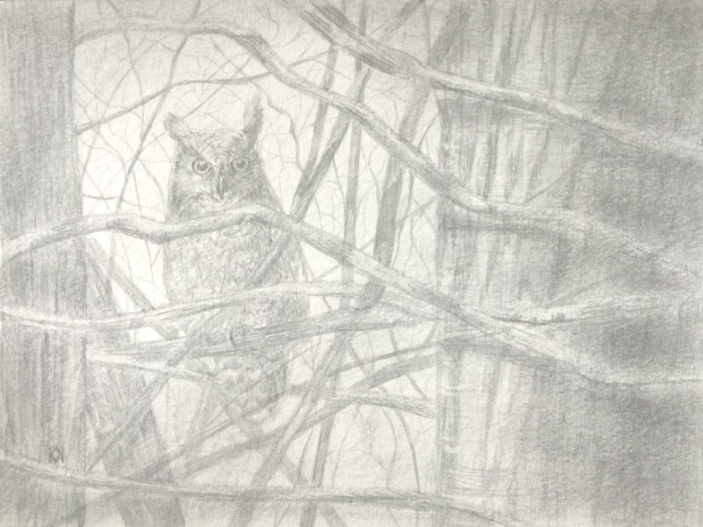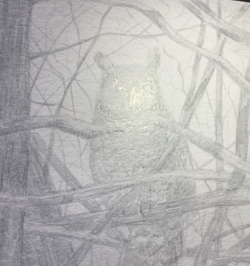 This owl settled into a tree and I took four quick, blurry pictures just to prove it happened. Metalpoint seemed to be a good medium for a mysterious, moody drawing.